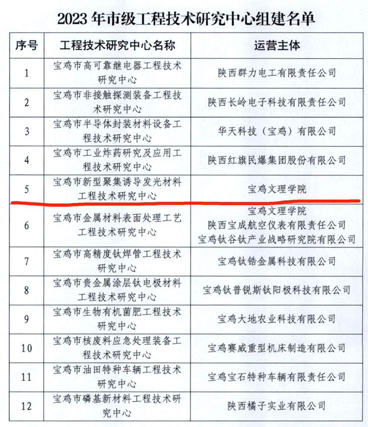 近日,宝鸡市科学技术局下发《关于公布2023年市级工程技术研究中心组建名单的通知》(宝市科发〔2023〕20号),公司AIE(聚集诱导发光)中心获批建设宝鸡市新型聚集诱导发光材料工程技术研究中心。