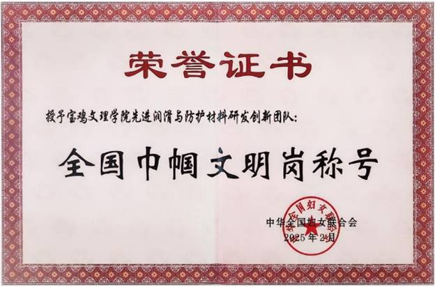 近日,公司“先进润滑与防护材料研发创新团队”凭借在科技创新领域的突出贡献和团队建设的卓越成绩,荣获“2024年度全国巾帼文明岗”国家级荣誉。