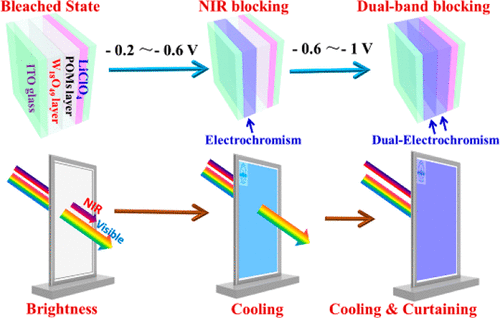 然而,因电致变色灵巧窗技术内在缺陷限制了其规模化使用,如着色效率低、响应速度慢、稳定性差和功能性不足等。顾洪溪博士等人将冠状多金属氧簇K28Li5H7P8W48O184·92H2O (P8W48)与W18O49纳米线连续组装构筑了双频调控电致变色器件。与传统的电致变色器件相比,该器件可通过施加不同电位实现主动选择性调控近红外光区与可见光区,实现亮度与温度双智能调控。并且基于P8W48与W18O49优异稳定性以及器件的精确结构控制,该电致变色器件显示出效率高、响应速度快、稳定性好等特性。这一器件的构筑与使用,为电致变色灵巧窗技术的使用和发展提供了新的思路,将极大地加速电致变色灵巧窗技术的规模化使用进程。(化学化工学院 文、图/田梅娟)