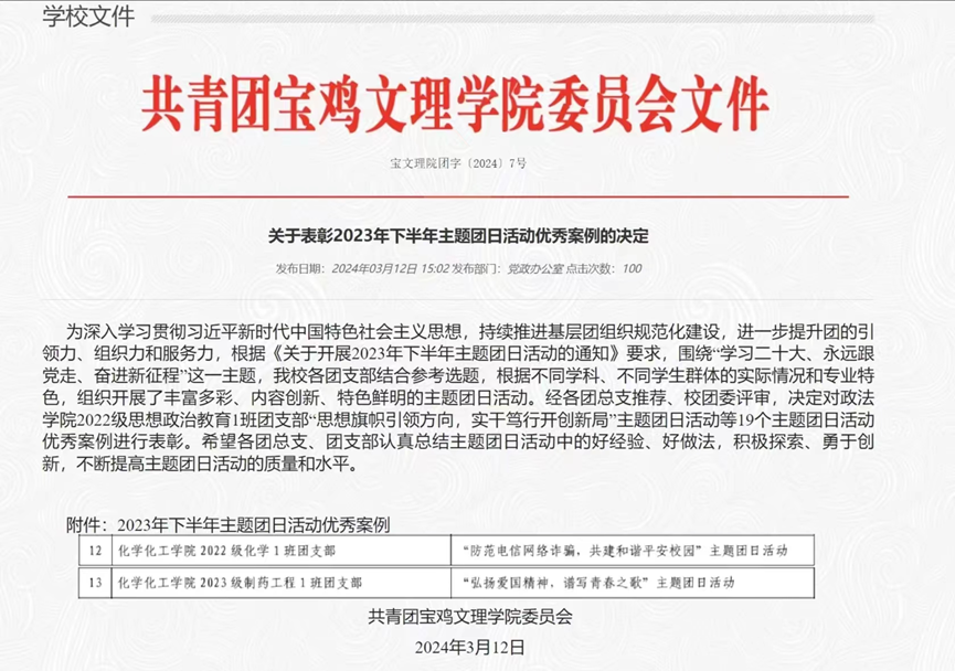 近日,校团委公布了2023年下半年“团日活动优秀案例评选”结果,公司2022级化学1班团支部“防范电信网络诈骗,共建和谐平安校园”主题团日活动和2023级制药工程1班团支部“弘扬爱国精神,谱写青春之歌”主题团日活动以规范的格式、丰富的内容、新颖的开展形式荣获团日活动优秀案例表彰。