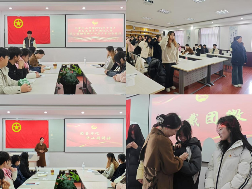 为深入贯彻落实党的二十届三中全会精神,进一步加强学院共青团的组织建设,引导广大团员青年将思想与行动统一到党中央的决策部署上,12月17日下午,化学化工学院团委于明理楼622室举行了2024年下半年新团员入团仪式暨学习贯彻党的二十届三中全会精神青年宣讲会。团委书记许小莉,团委副书记巨家琦、柴艺琳,2024年下半年新发展团员、优秀团员代表等共计30余人参加本次会议。本次会议由巨家琦主持。