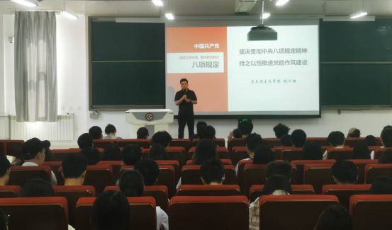张选朝以《坚决贯彻中央八项规定精神 持之以恒推进党的作风建设》为题,从中央八项规定出台的背景及意义,中央八项规定内容及其实施细则,违反中央八项规定精神的主要类型和持续开展常态化教育推进作风转变四个方面进行了详细阐述。报告内容丰富、逻辑清晰,既有理论高度,又紧密联系实际,使参会师生党员对中央八项规定精神有了更深层次的理解。