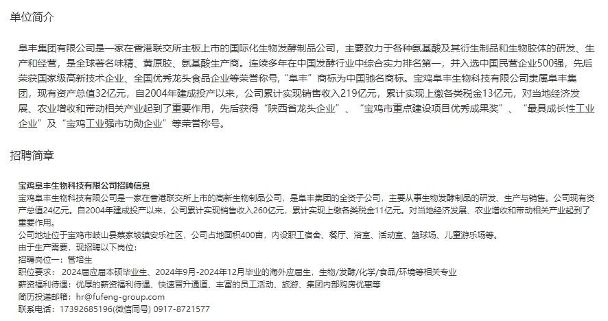 宣讲单位:宝鸡阜丰生物科技有限公司 宣讲时间:11月09日 下午15:00宣讲地点:明理楼六楼会议室