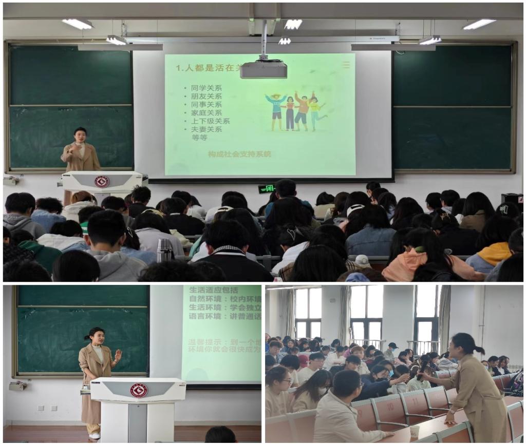 薛茹从“关于适应”、“老员工常见的心理适应问题”和“大学四年做什么”这三大方面开展本次讲座。她强调了“适应”对老员工的重要意义,并建议老员工确立明确的人生目标,调整好自己的心态,合理消费,通过各种有效的方法适应老员工活,以良好的心态应对宿舍、学习、经济上出现的问题,度过充实的大学四年。随后,薛茹带领现场同学们进行游戏互动,同学们与小组同学一起,在纸上画下自己理想中“家”的样子,现场气氛活跃。