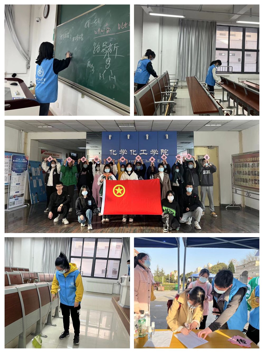 活动伊始,志愿者们在公司合唱歌曲《学习雷锋好榜样》,在悠扬的旋律中,雷锋高尚的形象仿佛再次活在了同学心中。随后,大家前往博文楼教室,进行擦黑板、打扫卫生等志愿服务活动,在实践中践行雷锋精神,为返校上课的同学们创造干净明亮的学习环境。同时,3月4日是新学期同学们返校第一天,志愿者们还在校门口协助检查返校同学们的核酸检测结果、扫描返校二维码、指引同学做二次核酸、维护返校现场秩序,共同助力化工学子平安返校。