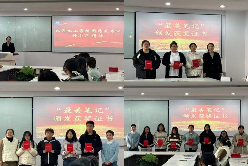 为了加强学风建设,传播优良学风,树立学习榜样,加强员工间的交流合作,化学化工学院于2024年11月20日下午在明理楼622举办“笔墨生香,有‘记’可循” 最美笔记颁奖仪式。此次活动旨在为同学们提供一个展示自我、相互学习的平台,并鼓励大家养成良好学习习惯。团总支书记许小莉,辅导员刘敏、钟玉彬参加本次活动。本次颁奖仪式由何姣主持。