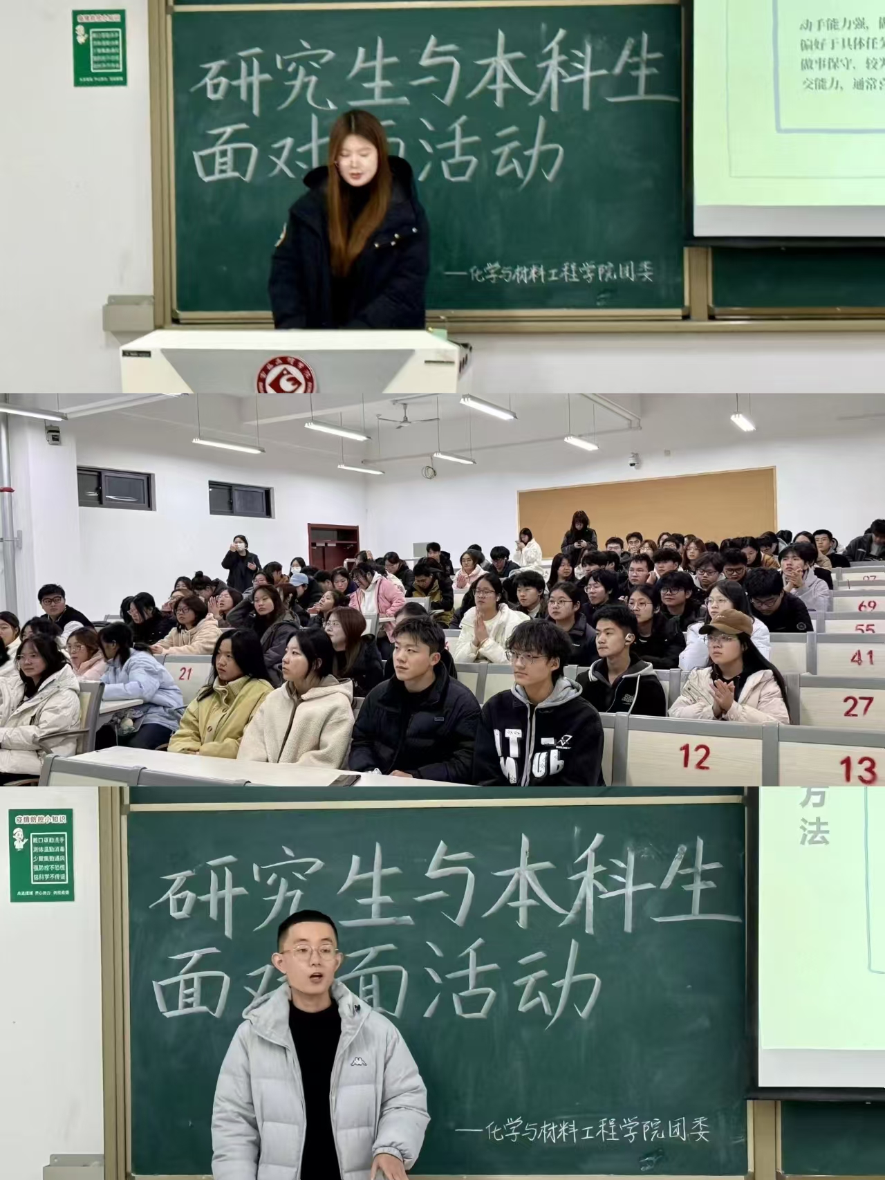 吴俊杰以“学术成长+综合发展”为核心,分三大模块层层递进:结合专业特色,拆解毕业论文选题、文献检索的方法及答辩技巧;针对新生适应痛点,分享心理调适、实验室协作沟通等经验,助力快速融入老员工活;围绕未来发展,详解考研择校原则、时间规划等,为新生搭建认知框架。李潇潇聚焦“职业规划:为未来赋能,为梦想续航”主题,立足化材行业发展趋势,结合自身求职经验,梳理企业研发、学术深造、公务员报考等路径,从实习经历的积累、到职业技能的提升,提供实操性的建议。
