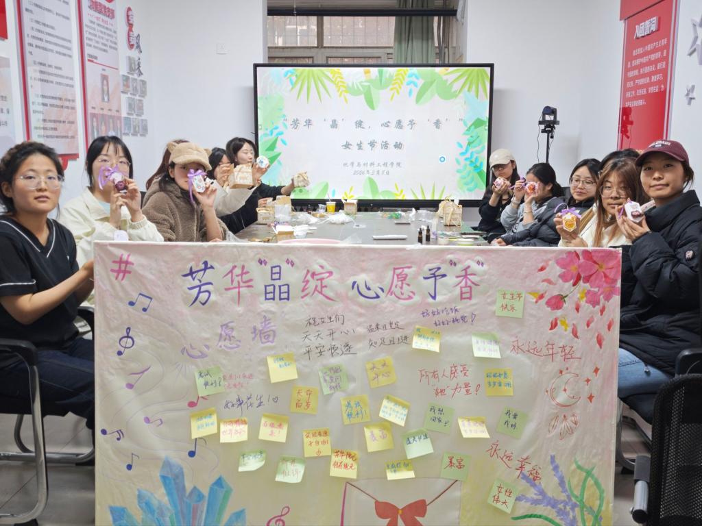 同步开展的“书写心愿寄语”则为同学们提供了情感抒发的窗口。琳琅满目的心愿卡片上,写满了女生们的真挚心声:既有对学业进步、实验顺利的期盼,也有对美好未来、多彩青春的憧憬,还有对身边师长、同窗的深深祝福。字里行间,流淌着化材学院女生们的温柔、坚韧、自信与梦想。这些心愿卡片与一旁的创意扩香石相映成趣,共同构成了一幅生动而温暖的青春画卷。